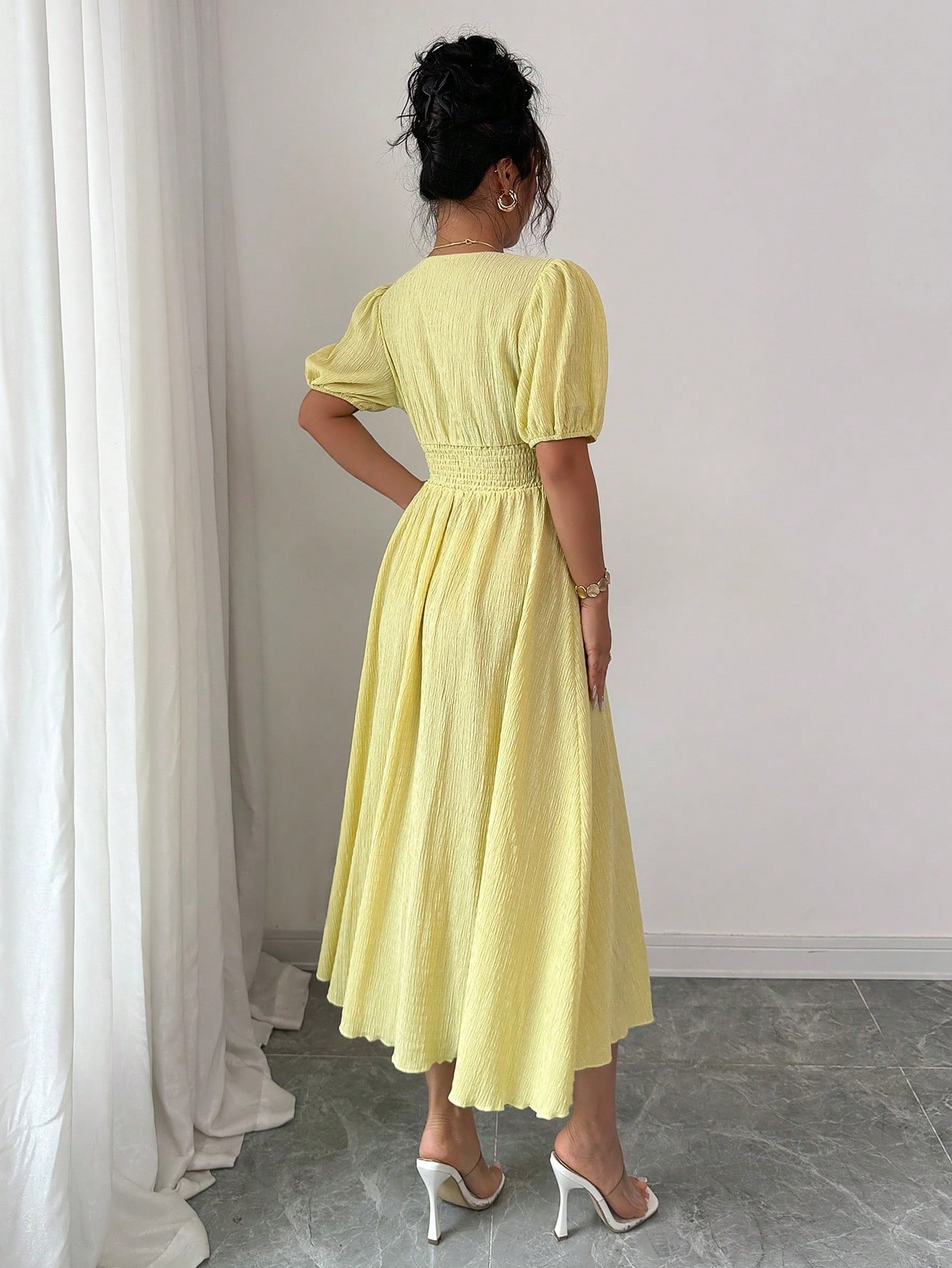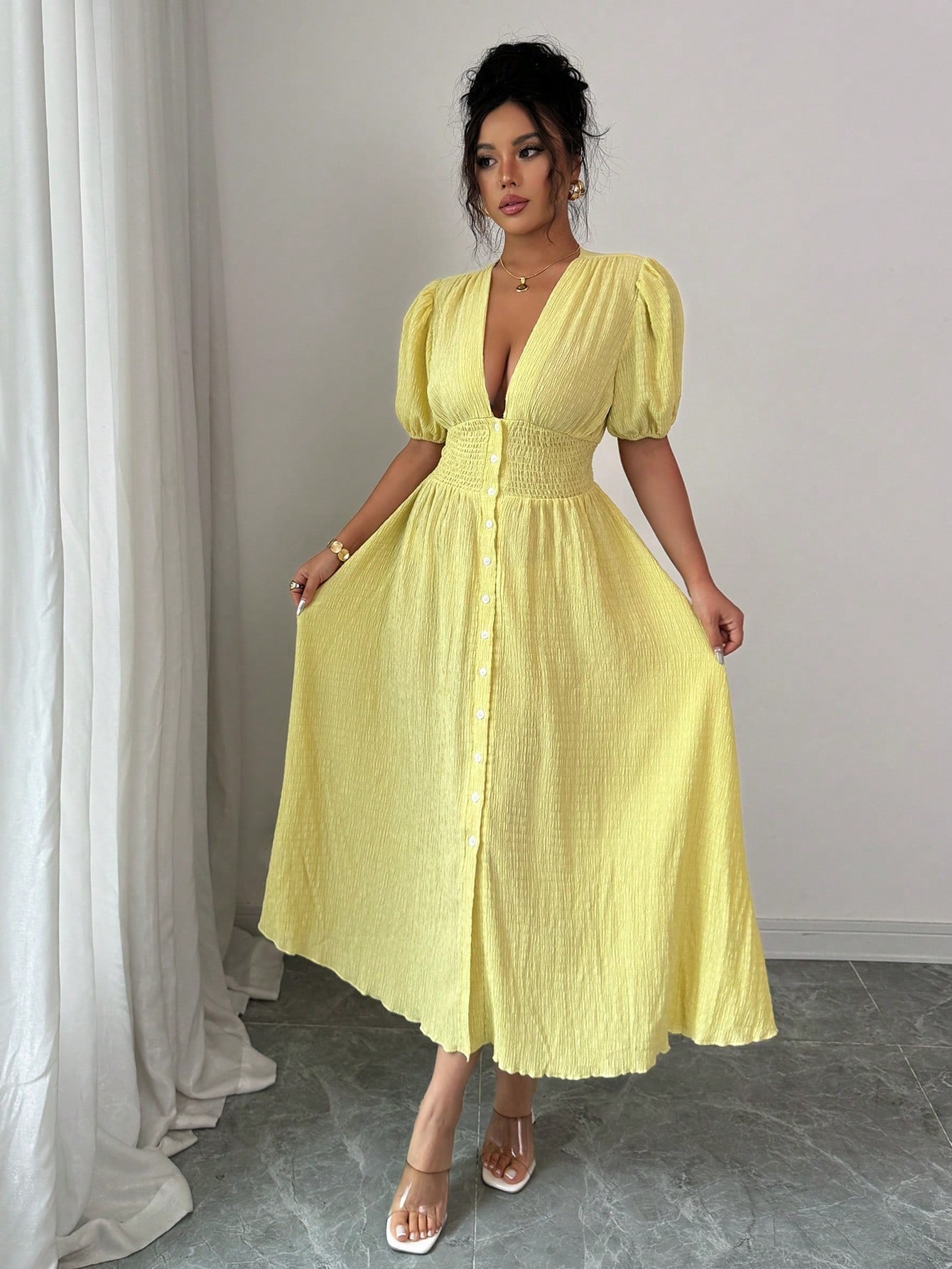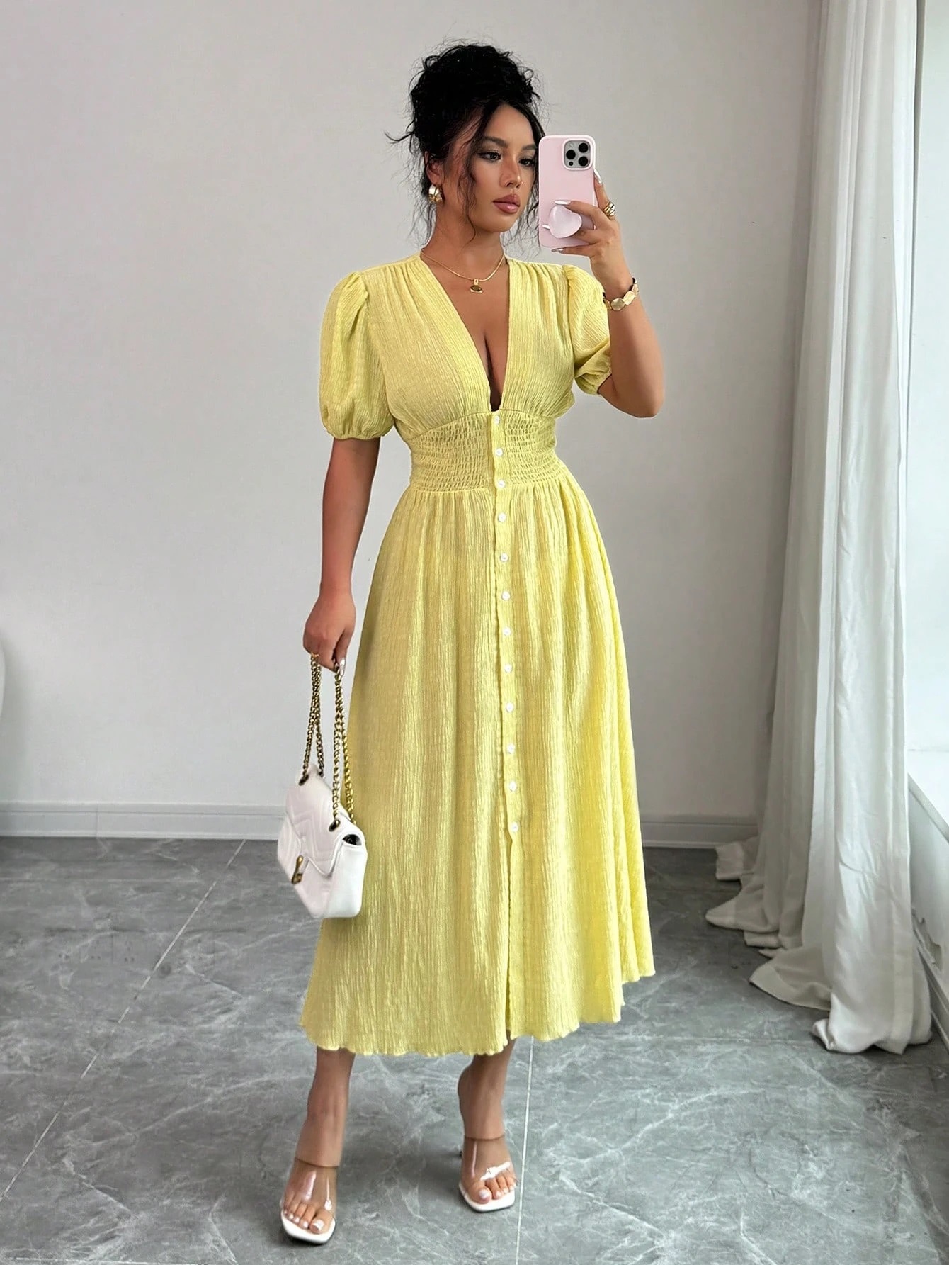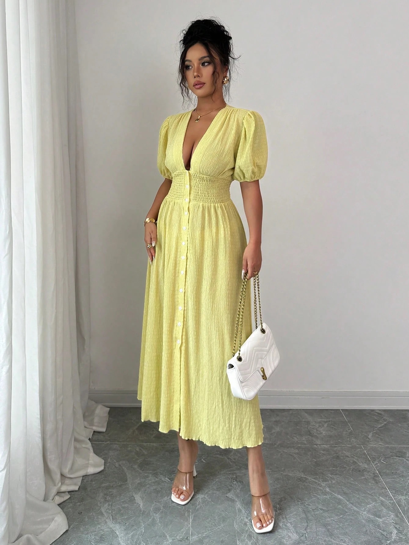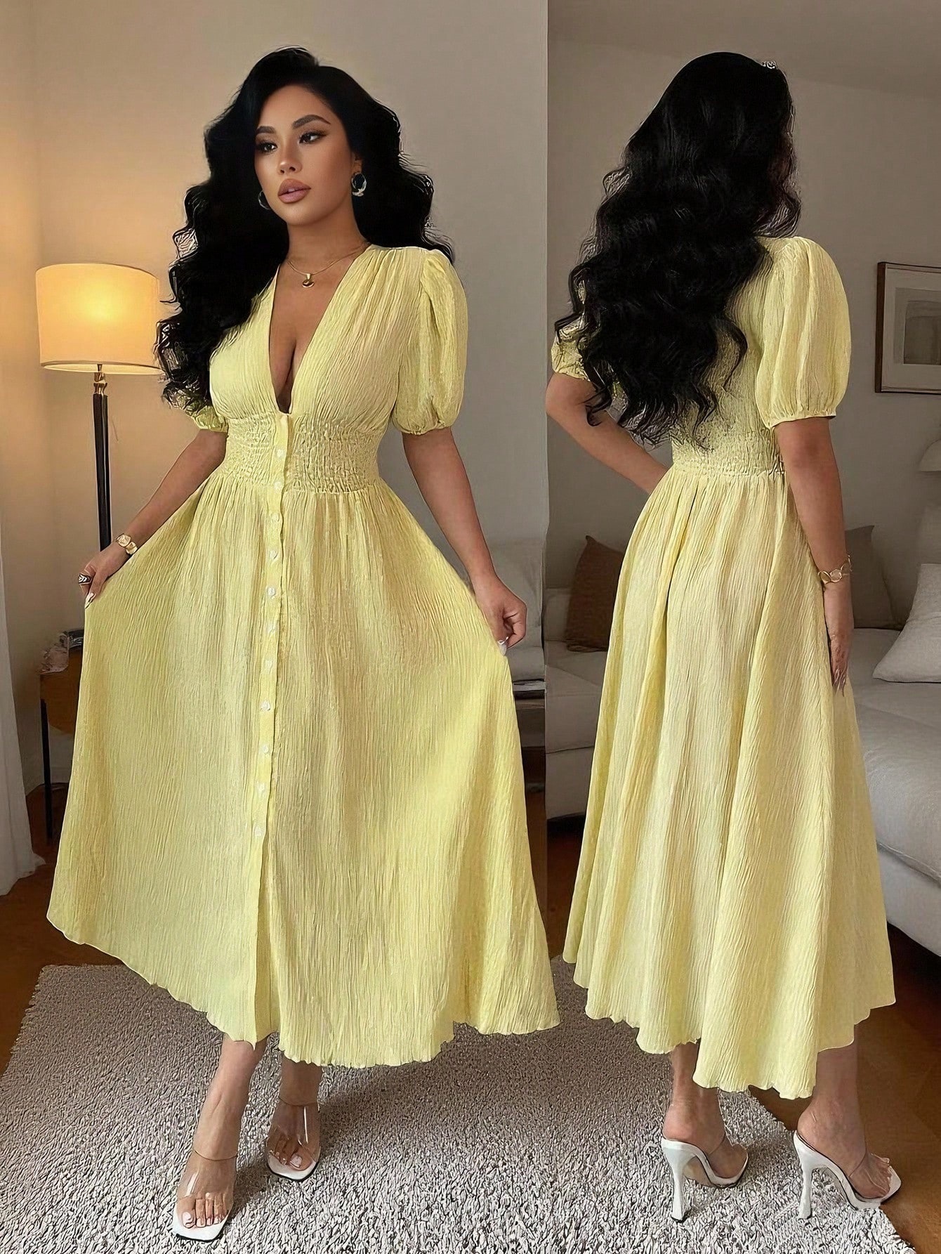 Elegant Women's V-Neck Puff-Sleeve Midi Dress For Women